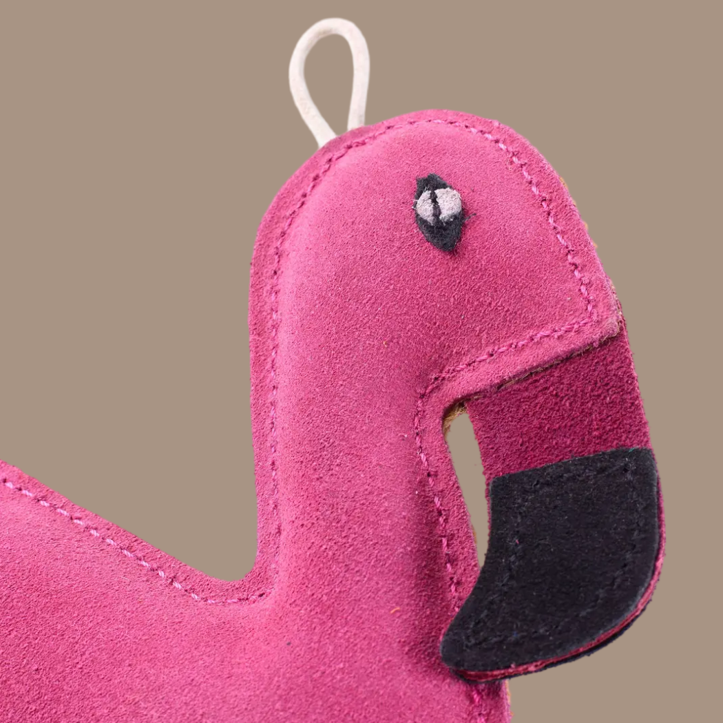 Floyd the Flamingo has a suede outer layer covering a filling of natural jute fibres and natural jute rope legs.