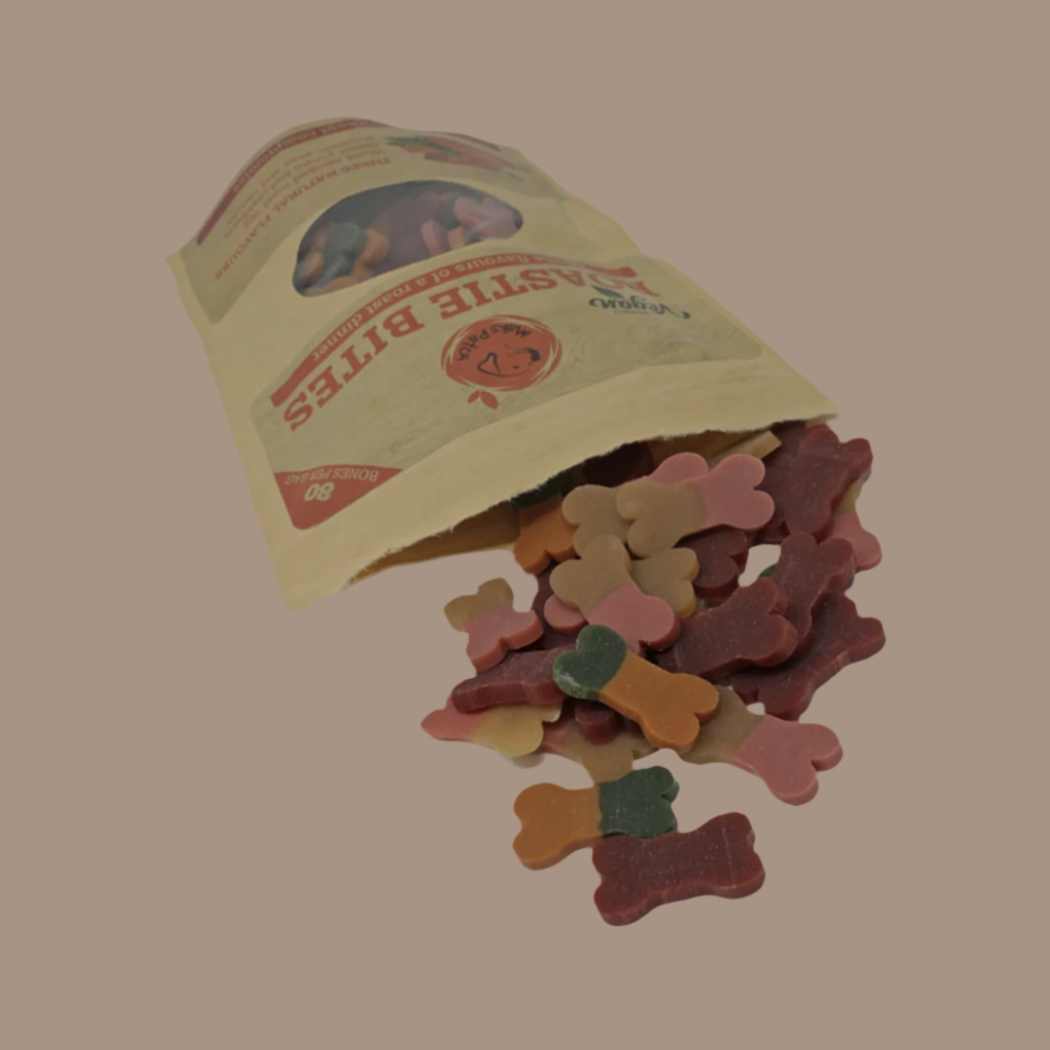 Roastie Bites come in a resealable zip kraft bag, 100g (approx 80 pieces).